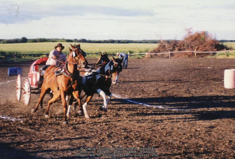 | Description: | Photograph of a chuck wagon driver during a race. |