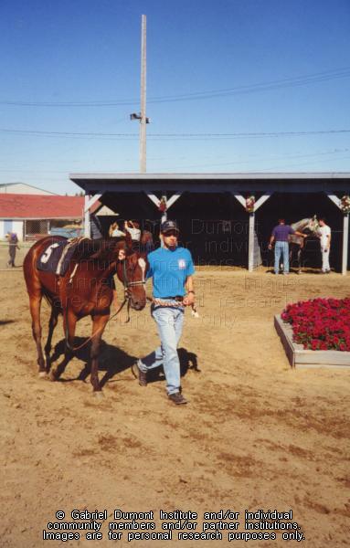 | Description: | Photograph Geordy McCaffrey walking with a race horse. |