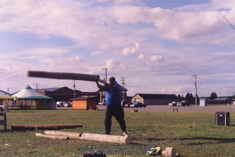 | Description: | Photograph of a man competing in the caber toss at the King Trapper Event in the Prince Albert Métis Fall Festival. |
