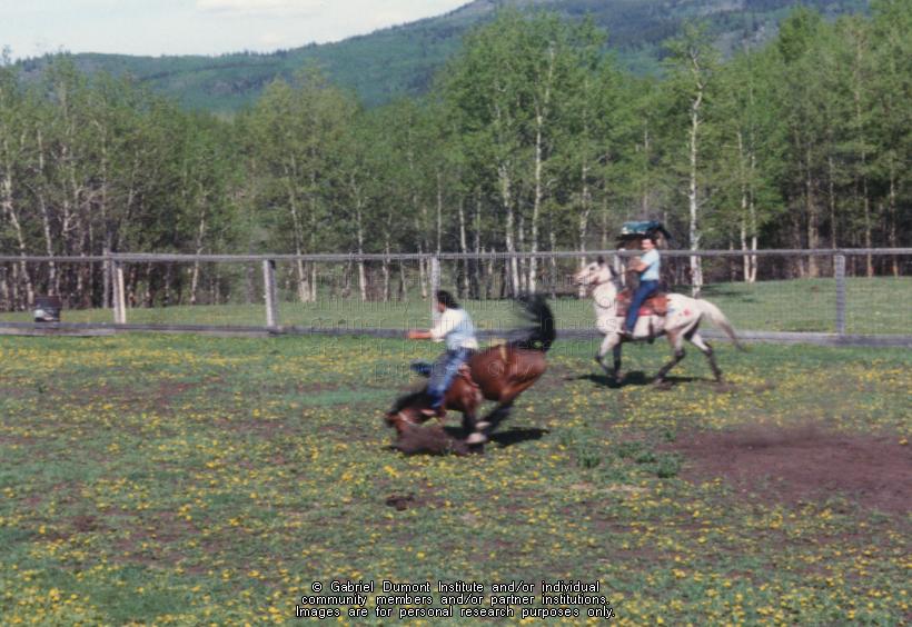 | Description: | Photograph of a man holding on as his horse attempts to throw him as another rider looks on. |