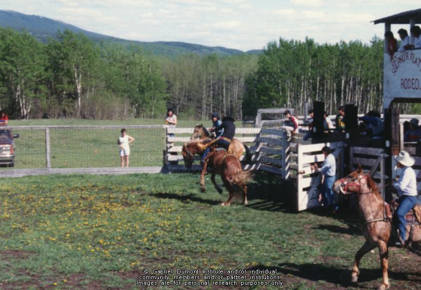 | Description: | Photograph of a man bare back riding as others watch on. |