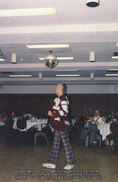 | Description: | Photograph of Todd Paquin, one -time Gabriel Dumont Institute Curriculum Development Officer, displaying his wierd clothing at a funny fashion show. |