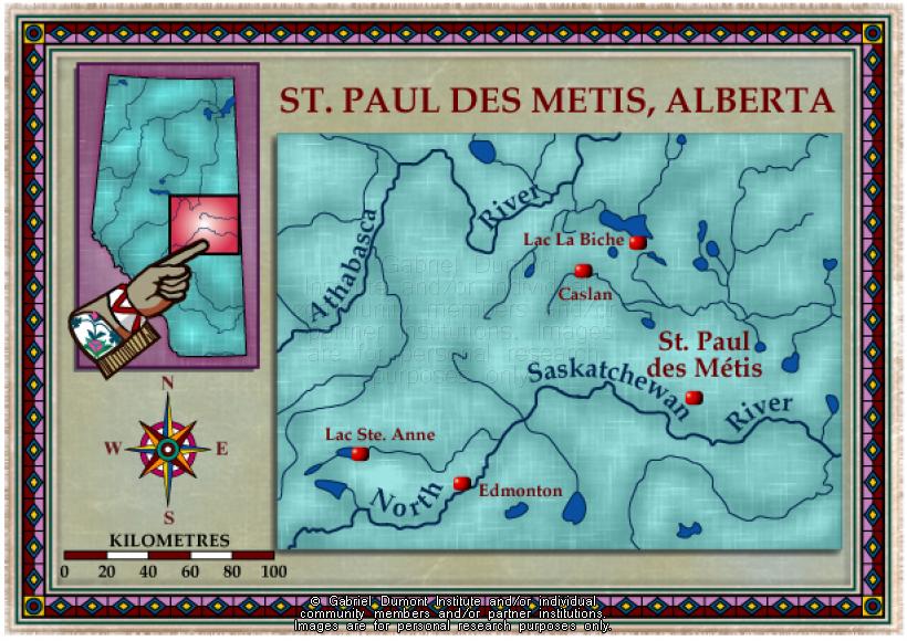 This is a map of St. Paul des Métis, a Métis farming colony founded by Father Lacombe in the 1890s. The colony was dissolved and the land given to French-Canadian farmers. The map was originally produced by the Gabriel Dumont Institute for the CD-ROM, "The Metis: Our People, Our Story". |