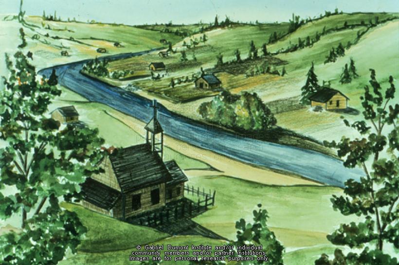 | Description: | Illustration of a Métis river lot community centred by a church. |