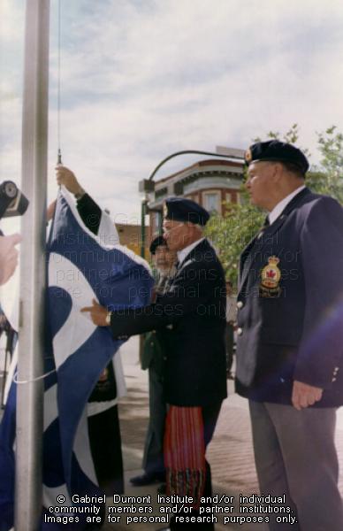 Photograph of Métis veterans raising the Métis flag during the Prince Albert Métis Fall Festival. Max Lucier is holding the flag and Claude Adams is to his right. |
