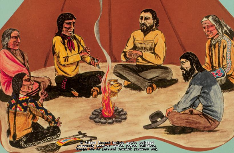 Illustration of Gabriel Dumont and First Nations men smoking a peace pipe from "Gabriel Dumont: Métis Legend". |
