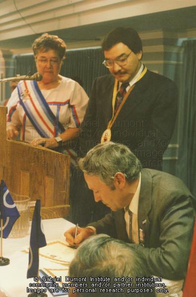 | Description: | Photograph of John Boucher signing a document while Senator Thelma Chalifoux and former Métis National Council president Gerald Morin looks on. |