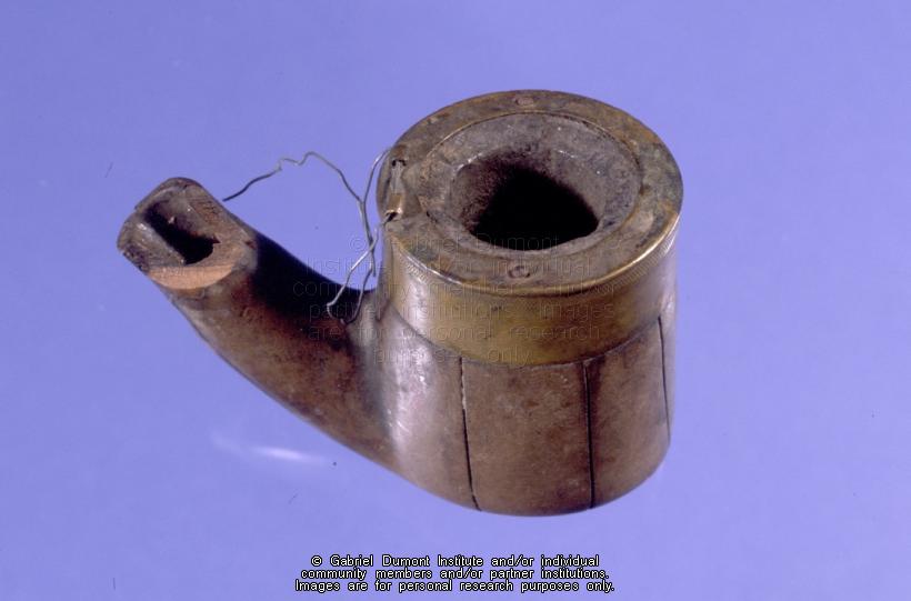 This is a photograph of a pipe from the A.C.D. Pigott Collection. It may have been owned by a Métis and may have been taken off the battlefield after the conclusion of the Battle of Batoche on May 12, 1885. This artifact is part of the A.C. D. Pigott Collection, which was donated to the Gabriel Dumont Institute in October 1991 by the Pappas family of Vancouver, British Columbia. The collection includes: Louis Riel’s English-French dictionary, Lieutenant Colonel Pigott’s 1885 Resistance battlefield manuscript, and a number of artifacts taken off the battlefield including: an inscribed watch, a pipe, a bullet maker and a buffalo powder horn (both from the Métis trenches), a carved wooden container taken from Big Bear’s camp, a First Nations decorative bracelet and horsehair braiding, which may have been traded for food by the Boulton’s Scouts. |
