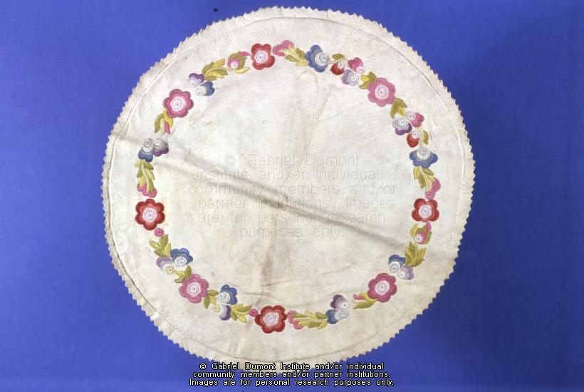 | Description: | Photograph of an embroidered lamp pad. This item is part of the Gabriel Dumont Institute Museum Collection. |