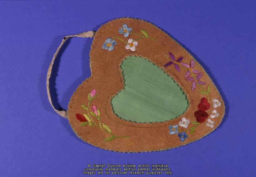 | Description: | Photograph of the front of an embroidered heart shaped picture frame. This item is part of the Gabriel Dumont Institute Museum Collection. |