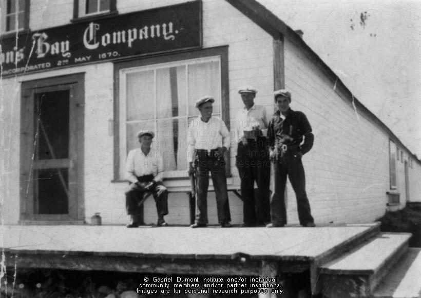 | Description: | Image of Ben Fiddler, Edward Sayese, Joe MacAuley, and Victor Nahees in front of the Hudson’s Bay Company Store, Cumberland House, SK.