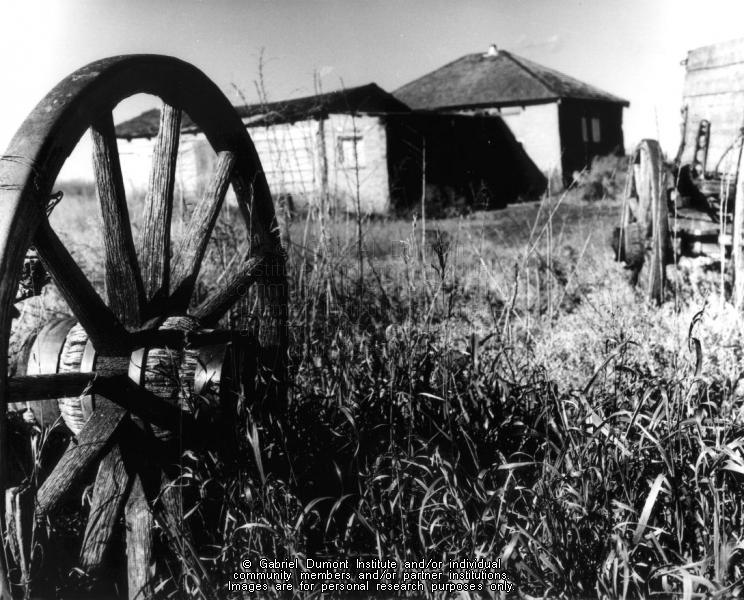 An image of an abandoned wagon wheel and farmhouses around Batoche, SK, circa the 1950s. Deryk Bodington (1914-), a professional photographer and a freelance writer working out of Calgary, Alberta, donated these images to the Gabriel Dumont Institute. The images were taken in the 1950s-70s and centre on Batoche and its environs. Bodington also donated photographs to the Glenbow Museum and Archives in Calgary and to the National Archives of Canada in Ottawa Ontario. He specialized in Western-Canadian landscapes and rural heritage. |