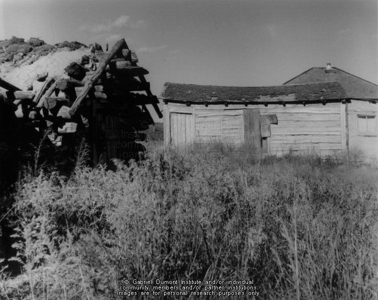 An image of abandoned farmhouses, made of logs and with a sod roofs, around Batoche, SK, circa the 1950s around Batoche, SK, circa the 1950s. An image of abandoned farmhouses and wagons around Batoche, SK, circa the 1950s. Deryk Bodington (1914-), a professional photographer and a freelance writer working out of Calgary, Alberta, donated these images to the Gabriel Dumont Institute. The images were taken in the 1950s-70s and centre on Batoche and its environs. Bodington also donated photographs to the Glenbow Museum and Archives in Calgary and to the National Archives of Canada in Ottawa Ontario. He specialized in Western-Canadian landscapes and rural heritage. |