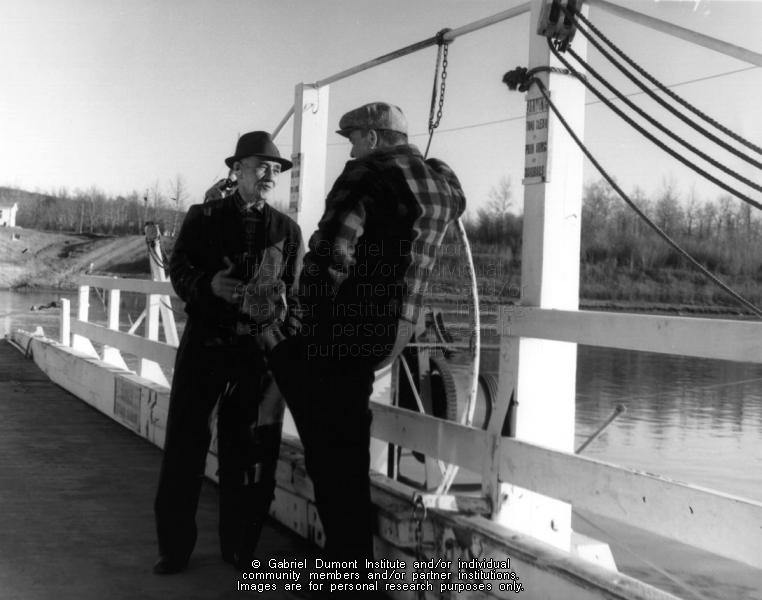 Métis Elder Ronald Lepine (Left) talks with ferry operator Stanley Sinclair on the ferry at St. Laurent, SK., circa 1950s. Deryk Bodington (1914-), a professional photographer and a freelance writer working out of Calgary, Alberta, donated these images to the Gabriel Dumont Institute. The images were taken in the 1950s-70s and centre on Batoche and its environs. Bodington also donated photographs to the Glenbow Museum and Archives in Calgary and to the National Archives of Canada in Ottawa Ontario. He specialized in Western-Canadian landscapes and rural heritage. |