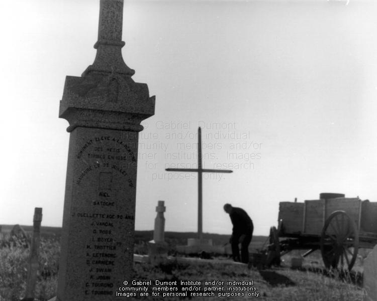 This image is a close-up of the memorial erected to commemorate the fallen Métis at Batoche in 1885. It was erected on July 23, 1901. The names listed on the memorial are J. Ouelette (age 90), J. Vandal, D. Ross, I. Boyer, M. Trottier, A. Letendre, D. Carriere, J. Swain, A. Jobin, C. Tourond and E. Tourond. Deryk Bodington (1914-), a professional photographer and a freelance writer working out of Calgary, Alberta, donated these images to the Gabriel Dumont Institute. The images were taken in the 1950s-70s and centre on Batoche and its environs. Bodington also donated photographs to the Glenbow Museum and Archives in Calgary and to the National Archives of Canada in Ottawa Ontario. He specialized in Western-Canadian landscapes and rural heritage. |