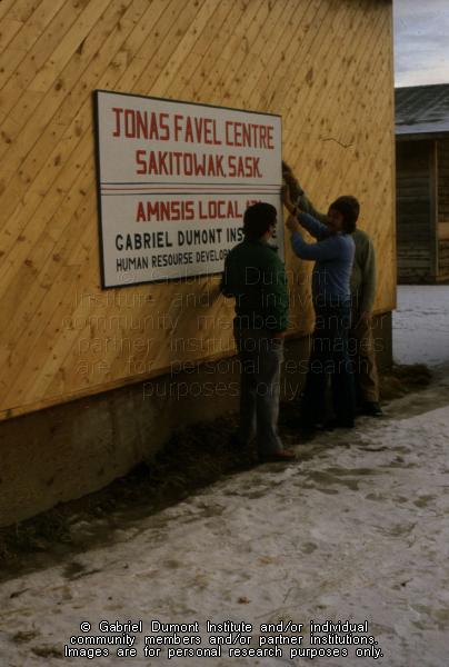 | Description: | Image of somebody putting up sign at the Jonas Favel Centre in Sakitowak, SK. The centre served as a local for the Association of Métis and Non-Status Indians of Saskatchewan (AMNSIS). AMNSIS was the forerunner of the Métis Nation – Saskatchewan. |