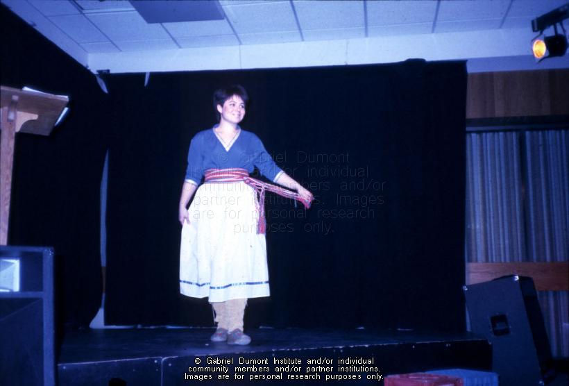 | Description: | Image of a woman modeling a traditional Métis dress with a sash (women never wore these traditionally) at fashion show. |