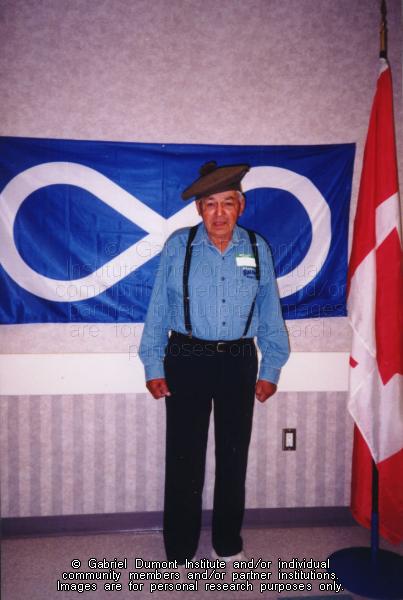 | Description: | Image of an Elder in front of Métis flag. |