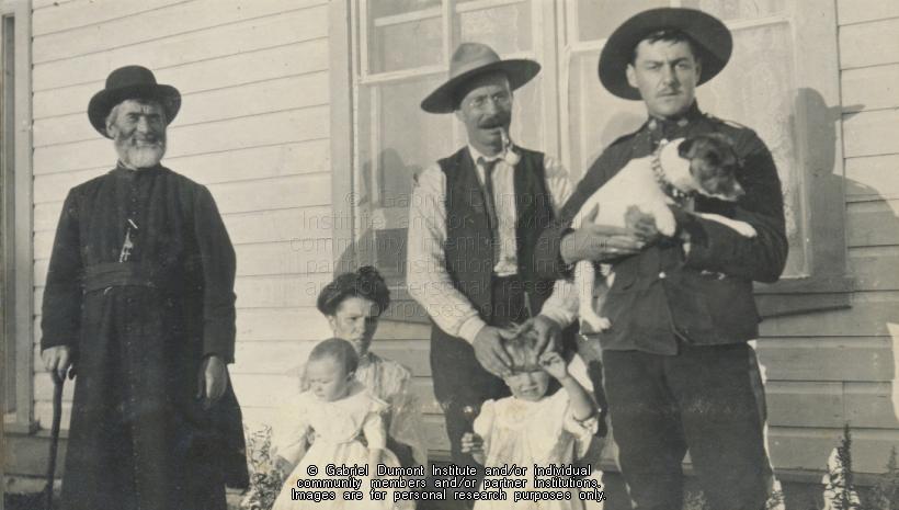 Father Jules E. Teston, an unidentified family (probably that of Edward Beatty, the Hudson's Bay Company Agent), and a Royal North-West Mounted Police (RNWMP) constable at the Hudson's Bay Company post at Green Lake, SK, August 1908. From the Frank J.P. Crean fonds.