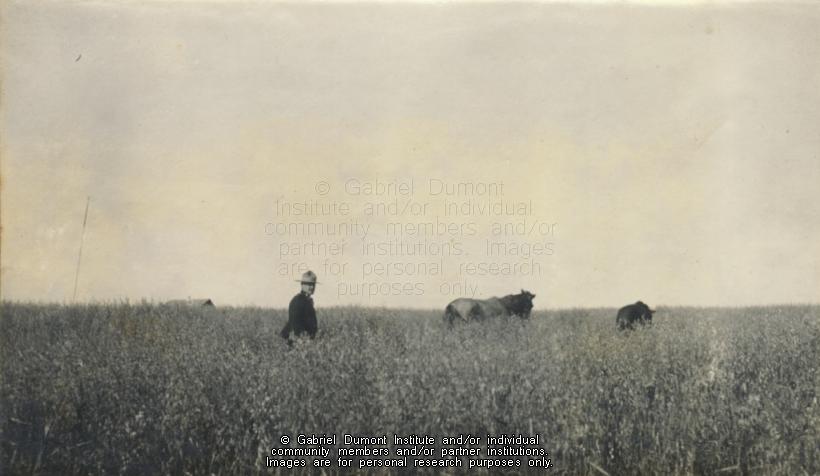 | Description: | Royal North-West Mounted Police (RNWMP) constable walking behind his horse through Father Teston’s oat field at the Green Lake settlement, SK, August 1908. From the Frank J. P. Crean fonds.
