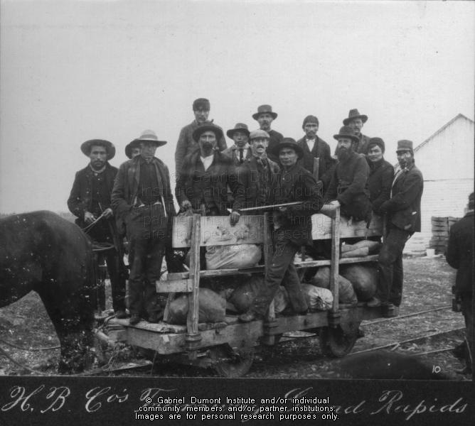 | Description: | A group of men on the carriage of the Hudson's Bay Company tramway, Grand Rapids MB, 1900. From the Narcisse-Omer Cote fonds. |