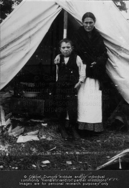 | Description: | Mrs. Marie Hodgson and a boy outside a tent, 1900. From the Narcisse-Omer Cote fonds. |