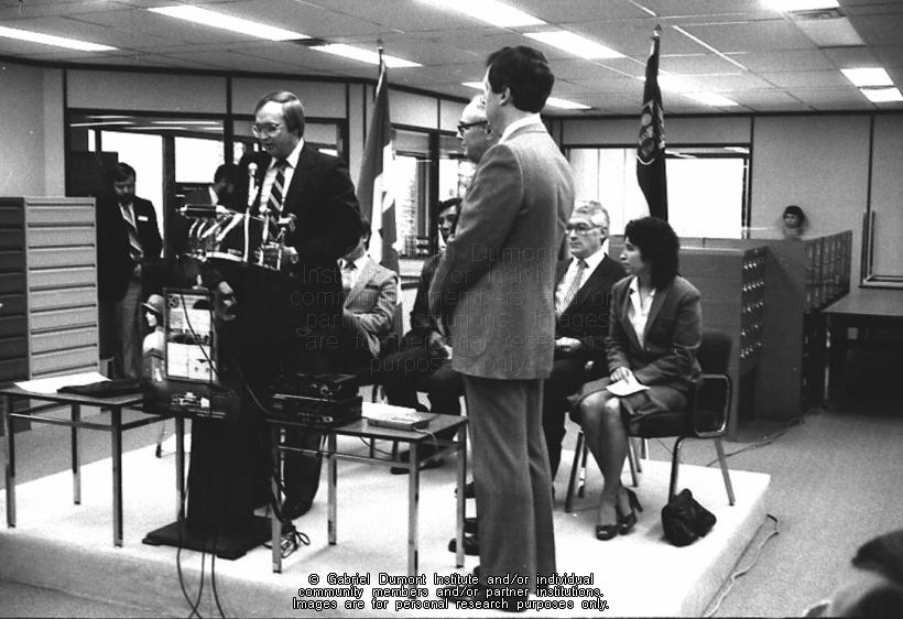 Rick Folk at the podium to present the diary of Louis Riel from the Saskatchewan government to Professor Norman Ward and Provincial Archivist Ian Wilson of the Saskatchewan Archives Board in Regina, Feb. 23, 1984. From the D.H. Bocking Collection.