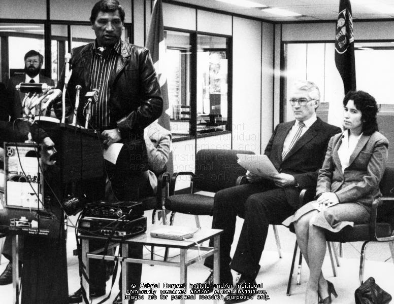 Jim Sinclair, President of the Association of Metis and Non-Status Indians of Saskatchewan, speaking at the presentation of Louis Riel's diary to the Saskatchewan Archives Board by the Saskatchewan government in Regina, Feb. 23, 1984. From the D.H. Bocking Collection.
