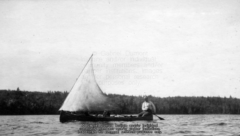 | Description: | A member of the New Northwest Exploration expedition in a canoe with a sail in a lake in northern Saskatchewan, 1908-1909. From the Frank J.P. Crean fonds.