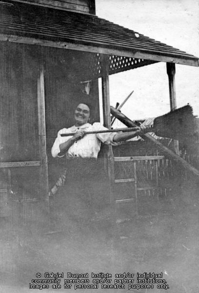 | Description: | A woman holding a broom at the Hudson's Bay Post at Ile a la Crosse, SK, 1908-1909. From the Frank J.P. Crean fonds. |