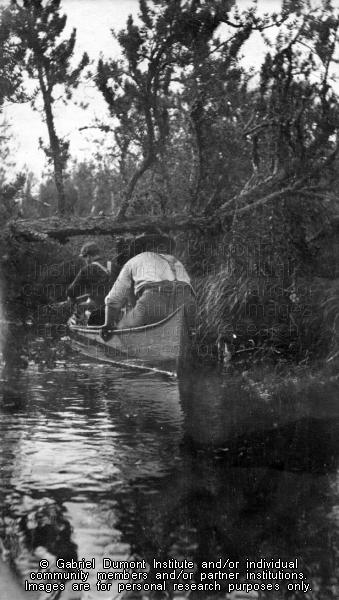 | Description: | Member of the New Northwest Exploration expedition in a canoe traversing a narrow stream in northwestern Saskatchewan, 1908-1909. From the Frank J.P. Crean fonds.