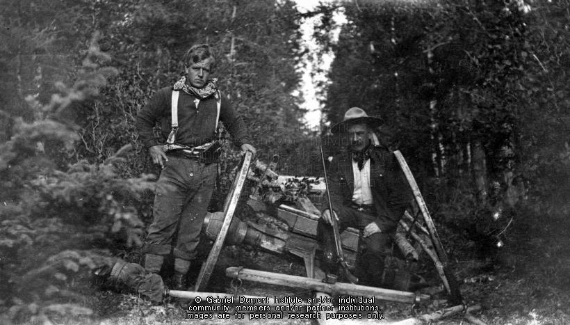 | Description: | T. George Street and Royal North-West Mounted Police (RNWMP) constable Thompson, both members of the New Northwest Exploration expedition, sitting on an old wrecked wagon on the Long Portage at Portage La Loche, SK, 1909. From the Frank J.P. Crean fonds.