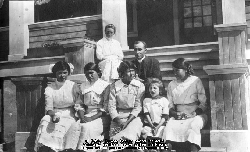 | Description: | Mackay School in The Pas, MB showing students, a minister and a woman [teacher?] on steps, July 1916 (Neg. copied 1980 SAB). From the Jervois Arthur Newnham fonds.