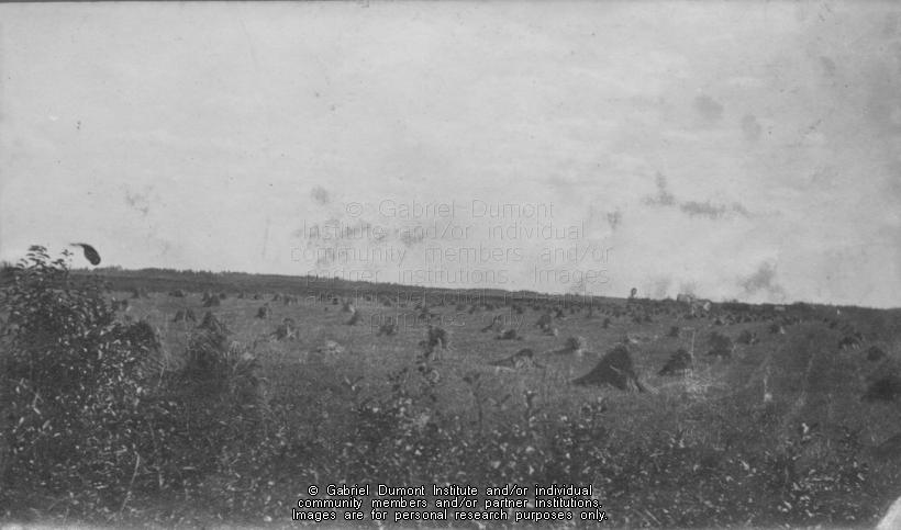 | Description: | Stooks on a farm on the Green Lake Trail, 65 miles from Prince Albert, Mont Nebo SK, 1908. From the Frank J.P. Crean fonds. |