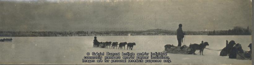 | Description: | A dog team crosses a frozen lake, Buffalo Narrows, SK, 1908-1909.