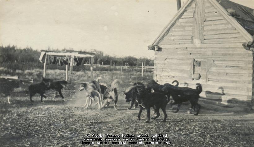 | Description: | Dogs in a Chipewyan village at the mouth of the "Buffalo River" (Dillon, SK), September 1908. Part of the Frank J.P. Crean fonds. |
