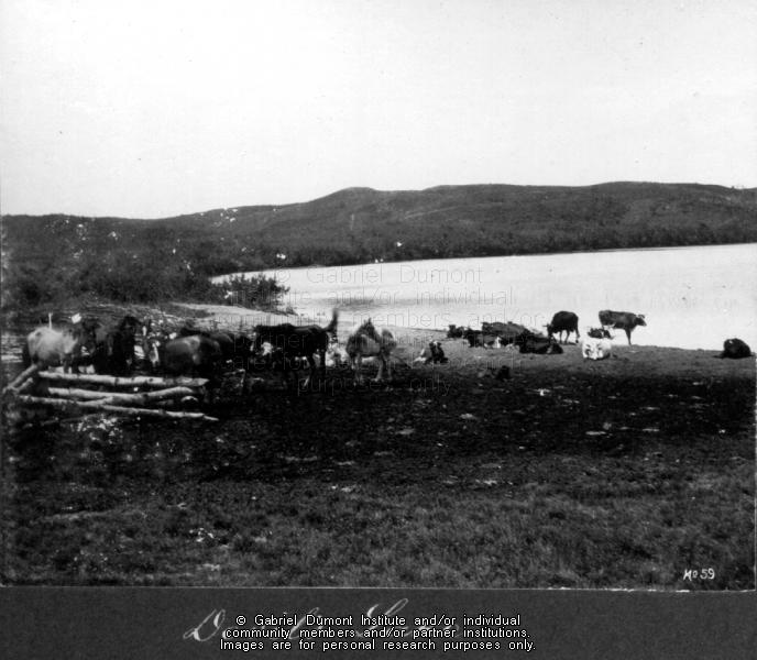 | Description: | Cattle and horses on the shore of Devil's Lake, near Sandy Lake Reserve, 1900. From the Narcisse-Omer Cote fonds. |