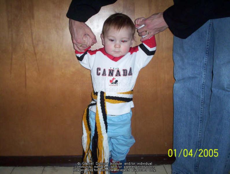 | Description: | Métis infant, Andon Morin, wearing a finger-woven sash. |