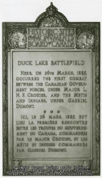 Historic Sites And Monuments Board of Canada Duck Lake Battlefield The plaque reads, "Duck Lake Battlefield - Here, on 26th March, 1885, occurred the first combat between the Canadian Government Forces, under Major L.N.F. Crozier, and th Metis and Indians, under Gabriel Dumont. Ici, le 26 mars, 1885, eut lieu la première rencontre entre les troupes du gouvernement du Canada, commandées par le Major Crozier, et les Métis et Indiens commandés par Gabriel Dumont." |