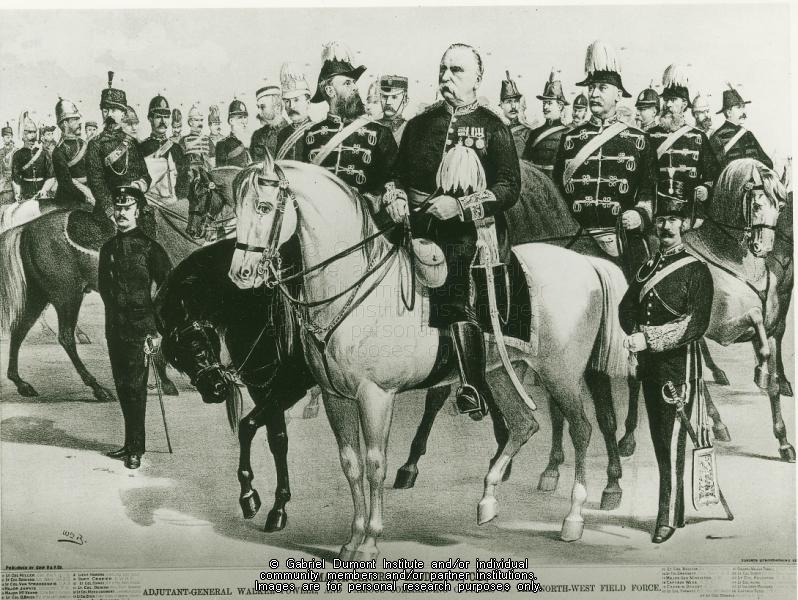 | Description: | Major-General Middleton, C.B., Adjutant-General Walker Powell, and various commanding officers of the North-West Field Force.