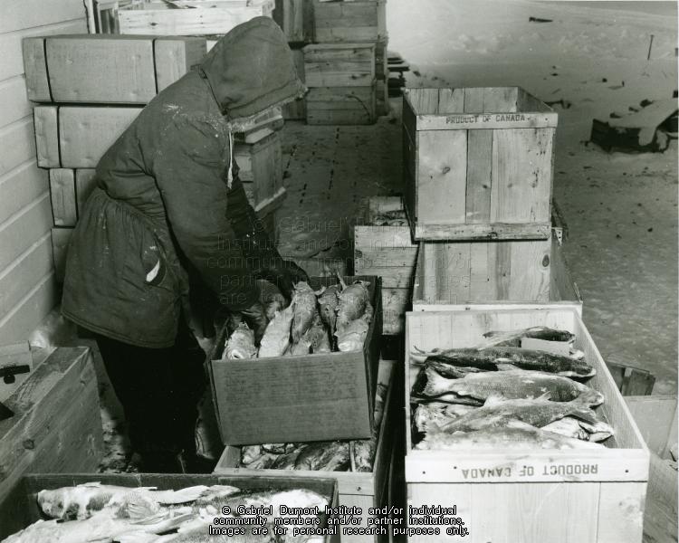 | Description: | A commercial fisherman at Hunter’s Bay on Lac La Ronge, piling cleaned fish into a stack before covering them with snow. Feb. 1957
