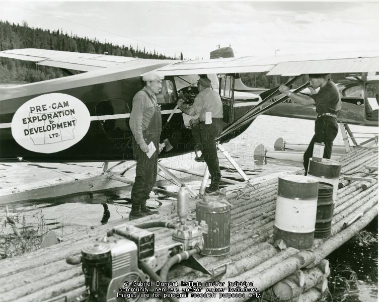 | Description: | “After receiving instructions by two-way radio, stakers Jim Brady (centre) and Joel Mackenzie (left) boarding a company plane en route to the Pre-Cam Explorations and Development Ltd. Claim Site, equipped with only the necessary tools and equipment. Photograph was taken in July 1957. |