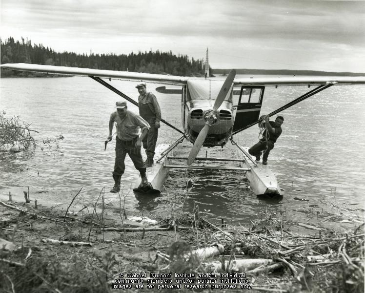 | Description: | “Twenty minutes after leaving the Pre-Cam Explorations and Development Ltd., base camp, the company’s Stinsor Pontoon equipped plane sets the stakers down on a lake near the claim site (L to R). Jim Brady, Joel Mackenzie, and Claude Fremont. Photograph was taken in July 1957. |