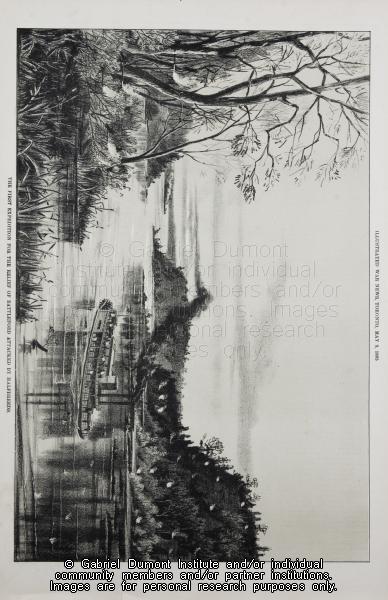 | Description: | This image, dated May 9, 1885, shows a wall-packed steamer traveling along the North Saskatchewan River in order to “relieve” Battleford, which was looted earlier by some Métis and First Nations on March 30, 1885. |