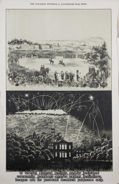 | Description: | This page shows two sketches from Montréal, which demonstrate how the city celebrated the end of the 1885 Resistance. These illustrations, based on sketches by P. Roy, include a military parade at Fletcher’s Field and a fireworks display on Mont Royal. French Canada celebrated the end of the campaign, but their attention soon turned to towards preventing Louis Riel’s execution.