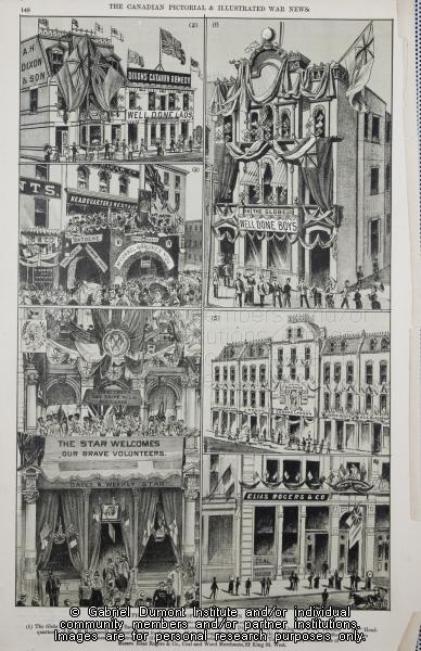 | Description: | This page contains various vignettes showing celebratory decorations in Canada’s two biggest cities: Montréal and Toronto. These illustrations have the following captions: “The Globe building, 26 & 28 King St. East, Toronto”; “Premises of Messrs. A. h. Dixon & Son, 305 King St, West, Toronto”; “’Headquarters’ of M. McConnell, wholesale dealer in cigars etc, 46 & 48 King St. East, Toronto”; “Publishing Office of the Star (J. Graham & Co.), St. James, Montreal”; “The Victoria Tea Warehouse, 93 King St. East, Toronto”; and “Head Office of Messrs. Elias Rogers & Co., Coal and Wood Merchants, 22 King St. West”. |