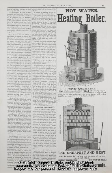 | Description: | On this page, (pg. 43, The Canadian Pictorial & Illustrated War News, date unknown), correspondents write about events that took place during the 1885 Resistance including false reporting about the military campaign, as well “disloyal” (read Irish nationalists) elements in the Dominion. Of note on this page are two advertisements that delineate late nineteenth-century tastes. |