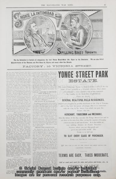| Description: | On this page, (pg. 35, The Canadian Pictorial & Illustrated War News, date unknown), correspondents write about events that took place during the 1885 Resistance including troop formations and movements, as well as supporting information for some of the illustrations that appear in this collection. Of note on this page are advertisements that delineate late nineteenth-century tastes.