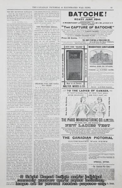 | Description: | On this page, (pg. 95, The Canadian Pictorial & Illustrated War News, no date), correspondents write about events that took place during the 1885 Resistance including information about the New Brunswick Battalion, as well as information about the possibility of Sergeant F. W. Curzon – an illustrator for The Canadian Pictorial & Illustrated War News – being awarded the Victoria Cross.  Of note on this page are advertisements that delineate late nineteenth-century tastes. |