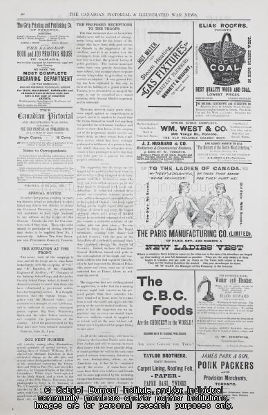 | Description: | On this page, (pg. 98, The Canadian Pictorial & Illustrated War News, June 27, 1885), correspondents write about events that took place during the 1885 Resistance including information about preparations to capture Big Bear’s Band, as well celebratory receptions for the troops. Of note on this page are advertisements that delineate late nineteenth-century tastes. |
